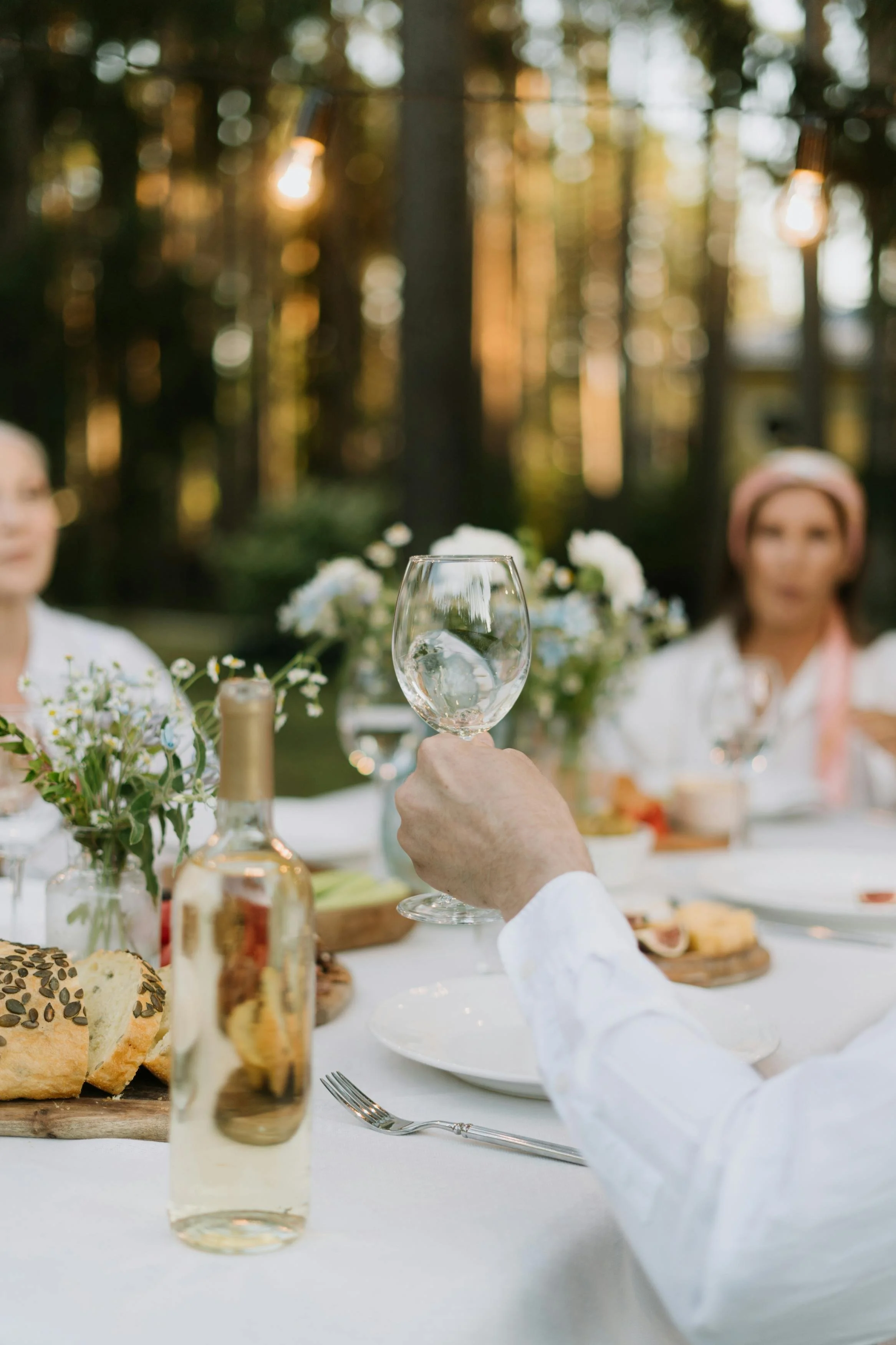 Just provide the food and drinks and we will take care of setting the table with white dinner plates, gold utensils, glasses, linen napkins and flower arrangements.